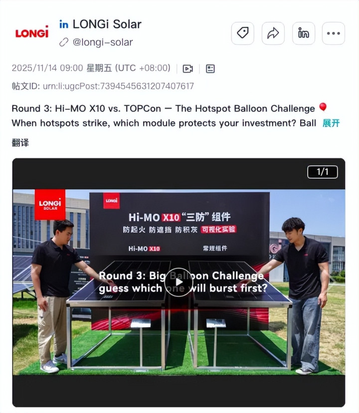 因此,隆基绿能(LONGi)在国际应酬媒体中,采选以短视频“PK”的样貌,模拟极点天气或热门事件发生后的组件防守本事,通过可视化样貌强化技艺确实度。