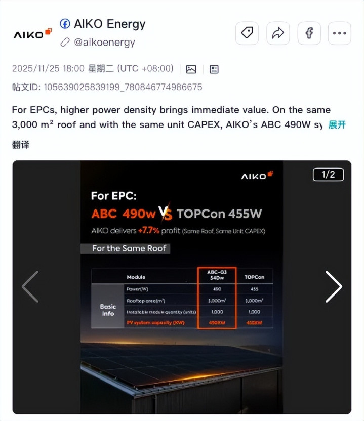 在国际阛阓,暧昧的“技艺跨越”难以酿成信任,确实能被通晓和转述的,是显著、可量化、可对比的数据抒发。如爱旭科技(AIKO)在国际传播中,会以极为直不雅的数据样貌呈现其技艺上风:在通常组件面积、通常单元成本开销的前提下,其最新电板技艺能够带来更高的发电量输出。