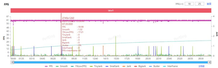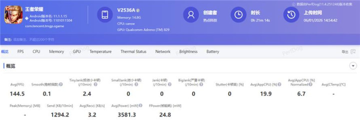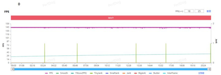 iQOO Z11 Turbo在《王者荣耀》中撑持144fps+极限画质档位,况且亦然通过KPL比赛用机测试认证。那咱们在144fps+极限画质下,进行测试,测得游戏的平均帧率可以达到144.5fps,平均功耗为3.58W,通过帧率图可以看到游戏全程莫得出现掉帧的情况。