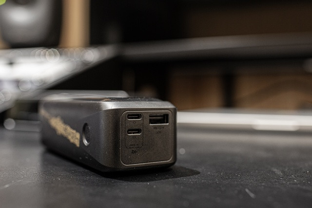 充电宝的一端为一个USB-A输出口、两个type C输入/输出口,另一端为和洽充电底座使用的触点,侧面是一个有立体纹理的按键。