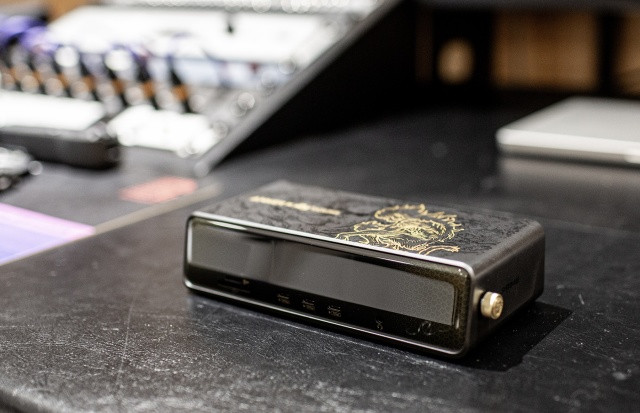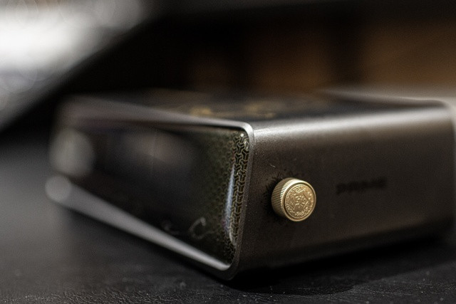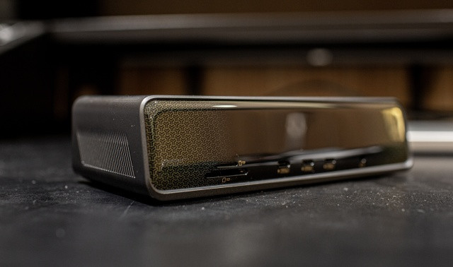 彭胀坞的正面共有六个接口,辞别为TF、SD读卡器插口、三个type C接口、一个3.5mm耳机接口;右侧是一个金色的小旋钮。