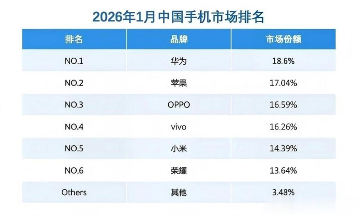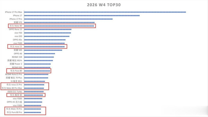 随着鸿蒙生态的不断完善,华为手机的竞争力持续增强,销量也水涨船高。2026年W4,华为8款手机挺进TOP30,入选的机型数量持续增加,说明华为旗下多款手机在不同价位段均展现出强大产品力与用户认可度。从机型数量方面来说,华为占比已超1/4,远超其他友商。得益于多机型的同时热销,根据第三方的数据,2026年1月,华为以18.6%的市场份额超越苹果登顶国内第一。