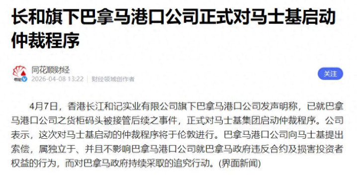 4月7日,长和旗下的巴拿马口岸公司晓示对全球航运巨头马士基拿起海外仲裁。