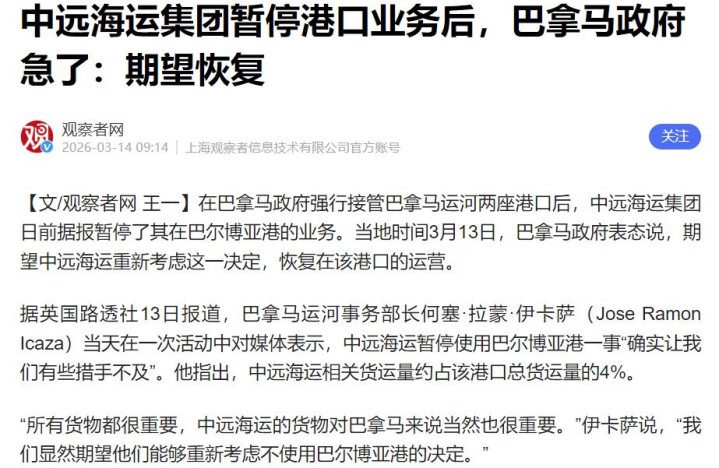 巴拿马运河事务部长伊卡萨3月13日对媒体提到,中远海运暂停巴尔博亚港业务“让东说念主措手不足”,并命令中方从头计议。