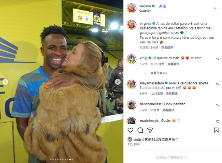 赛后,维尼修斯的女友维吉尼亚在社媒晒出了我方现场不雅战,开云sports并与维尼修斯亲密合影的像片,牛牛并配文谈:“在回巴西之前,先快速去一回卡斯特利翁,看我的宝贝踢球并赢球哈哈哈!PS:要是不是为了穿上男一又友的文化衫和球鞋,我致使不披缁门。”