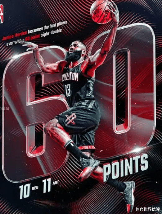 哈登是第一位砍下60+三双的球员,2018年1月31日,赶巧巅峰的哈登出场46分钟,30投19中,三分球14投5中,罚球18罚17中,赢得60分10篮板11助攻的超等三双。