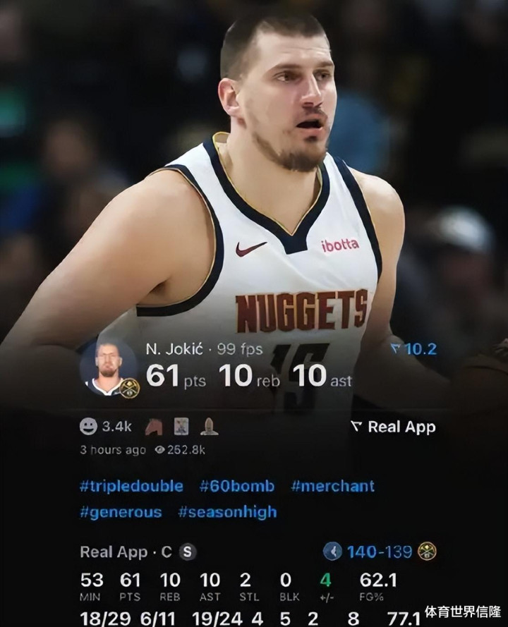 2025年4月1日,约诚实再创神迹,他整场比赛29投18中,三分球11投6中,拿下了61分10篮板10次助攻的大号三双数据。看成中锋,能砍下60+三双实属不易。
