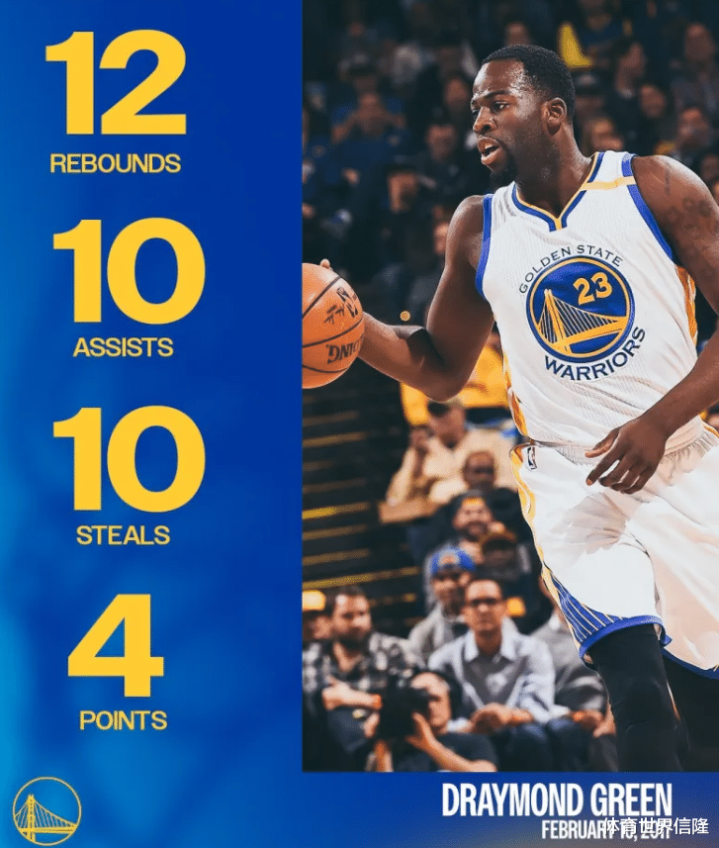 2017年2月10日,格林打出那场4分12板10助攻10抢断5封盖的比赛,他是第一位打出得分不上双三双数据的球员,亦然第一位打出10抢断+5封盖数据的球员。于今仍有东谈主为其感到缺憾,竟然以这么的花式错失四双数据。