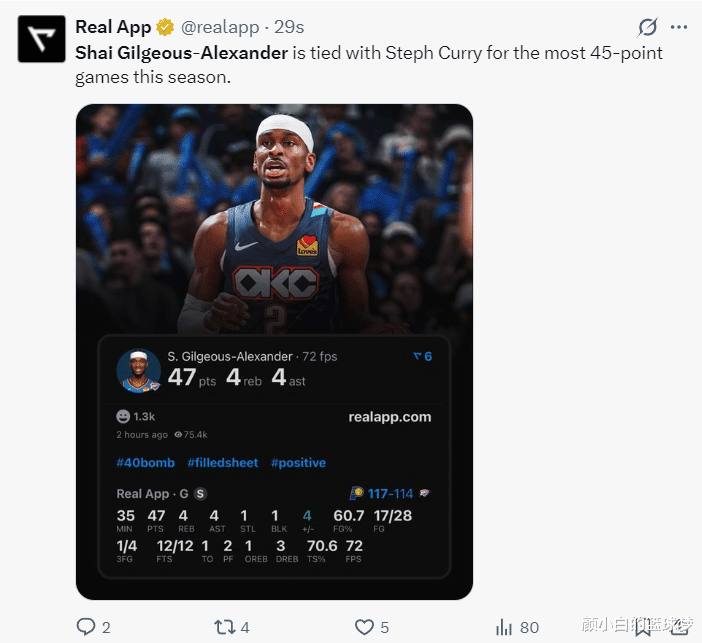 此役SGA创造多项记录:1.这场比赛SGA延续了我方连结116场20+;