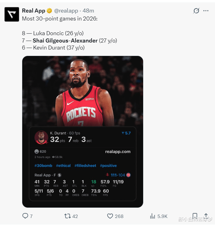 3.2026年SGA拿到7次30+仅次于东契奇;