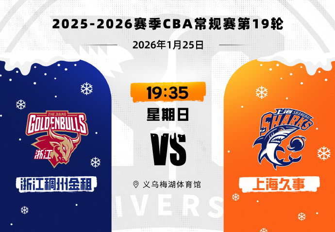 虎扑01月24日讯据上海男篮官方发文,2026年1月25日,2025-2026赛季CBA联赛老例赛第19轮,上海久事客场挑战浙江稠州金租。