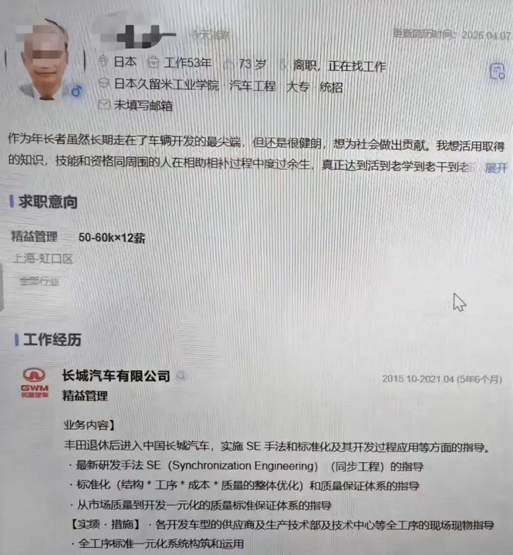 73岁,责任53年,刚从长城汽车去职。求职意向:精益处分。守望薪资:50-60k×12薪。