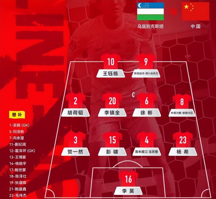 第四场淘汰赛对阵乌兹别克斯坦,安帅对上一轮首发进行2东说念主微调,杨希、李镇全顶替杨皓宇、剻纪闻,木塔力甫从头回到右前锋位置,杨希上场司职右边后卫。