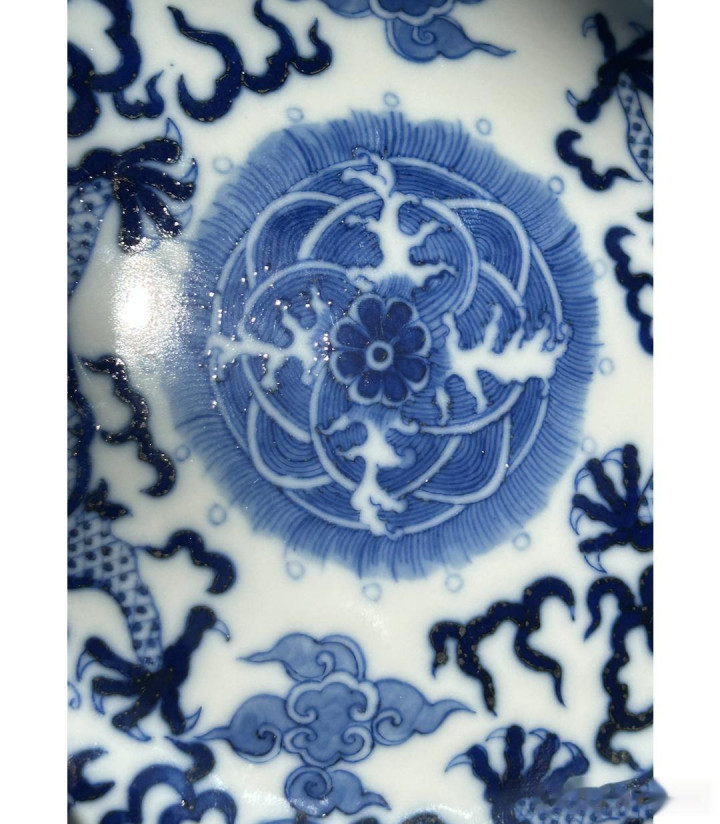 外壁守密简练而不失肃穆,绘同向追赶的行龙两条,与盘内纹饰主题一致,表里一体,气韵知晓。