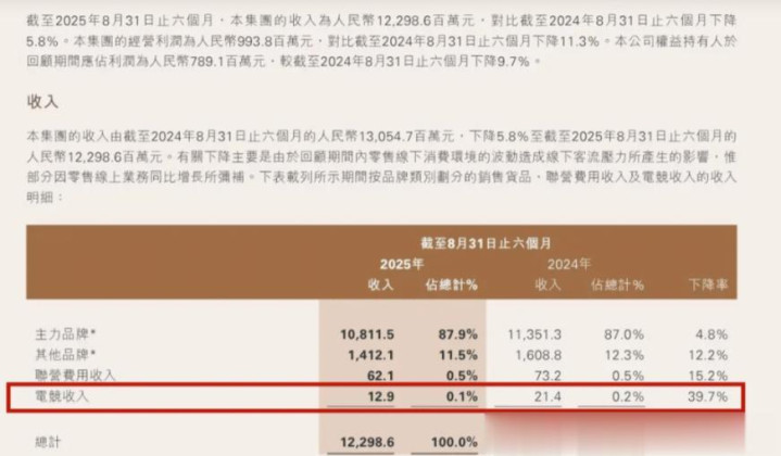 这一变化,在财报中体现得尤为直不雅,近期滔搏电竞公布的中报线路,其电竞相干营收同比暴跌39.7%,简直少了四成,不同于一些“看不见账本”的俱乐部,滔搏背靠上市公司,财务数据必须同一深切,因此这份数字具备很强的参考价值,标准到2025年8月31日的半年报中,滔搏电竞板块营收仅为1290万元,而这还仅仅收入,并非利润。