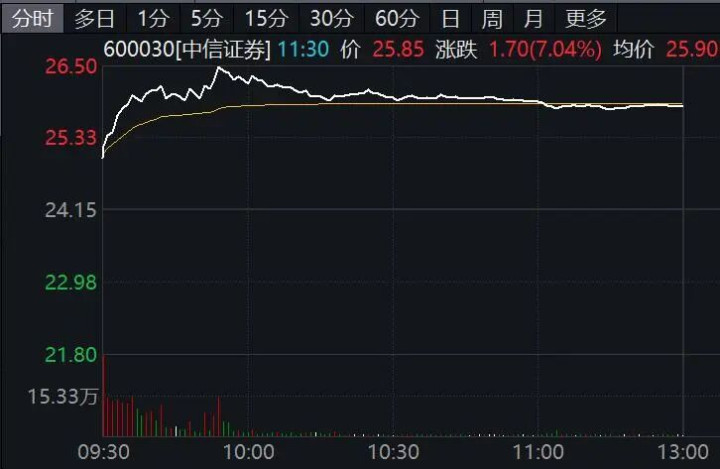 券商股早间全线走强,板块指数高开高走,一度放量大涨逾5%,开盘不到20分钟成交就卓越昨日全天成交。板块内扫数个股飘红,哈投股份涉及涨停,中信证券、东方金钱、长江证券、广发证券等涨幅居前。