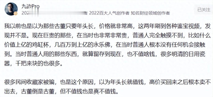 在网上看到过一个见笑,说眼下这片土壤,王人几百年了,果真正经八百的古董,然则你完全不会费钱去买一捧土的。因为那土天然时代久,然则它不稀缺,哪王人有,是以就不值钱。这天然是一个极点的例子,是一个见笑,但它背后折射出来的意旨即是:不是通盘的古董王人价值腾贵。