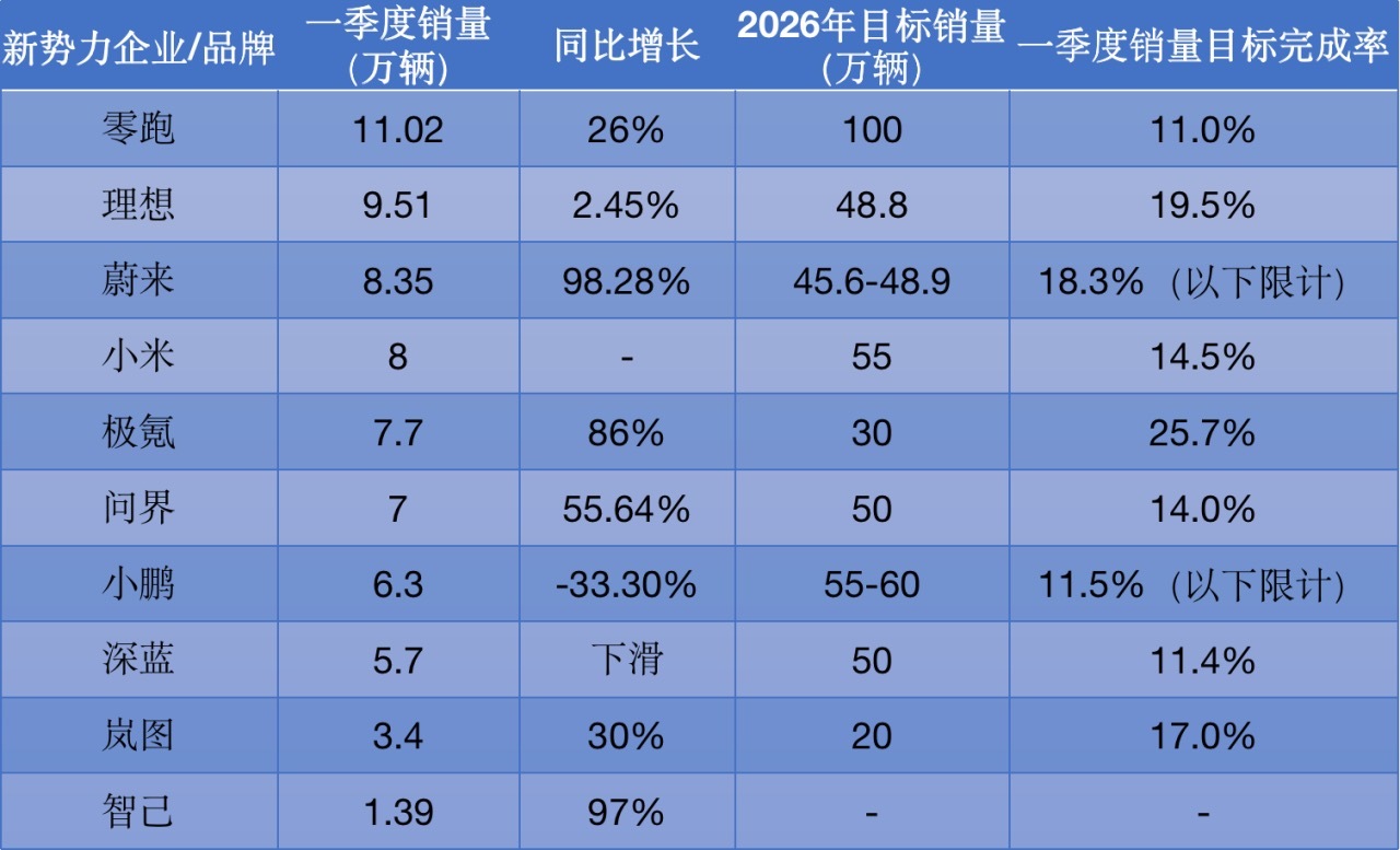 比较2025年,本年一季度新势力名次发生巨变。2025年的前三名——零跑、鸿蒙智行和小鹏汽车,在本年一季度变为:零跑仍居榜首,理念念和蔚来重回第二和第三。鸿蒙智行未公布一季度销量,但把柄赛力斯公告,问界一季度仅售出7万辆,名轮番六;小鹏则跌至第七。