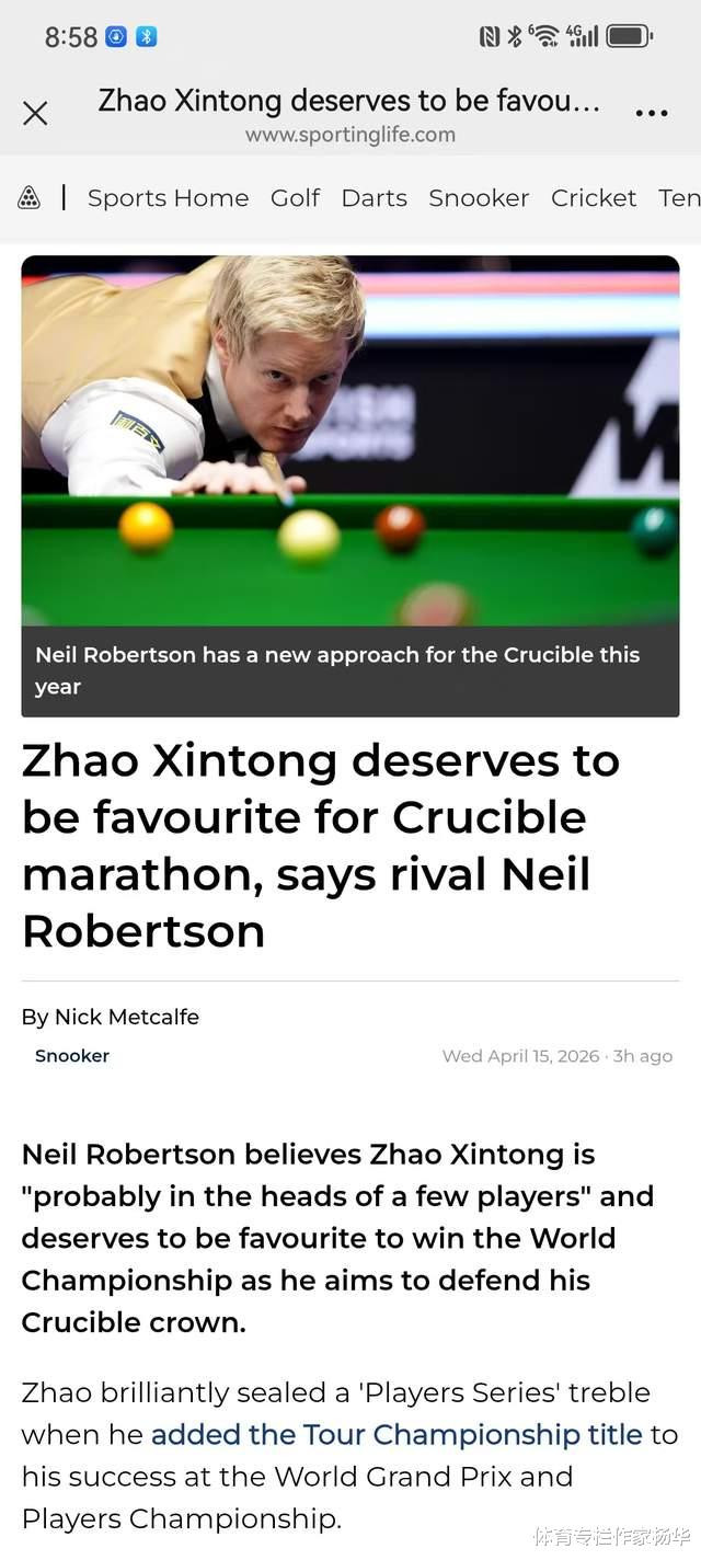 澳大利亚斯诺克明星尼尔·罗伯逊认为,赵心童“简略如故让不少选手心生胆寒”,在他盘算推算卫冕世锦赛冠军之际,理当成为夺冠第一热点。