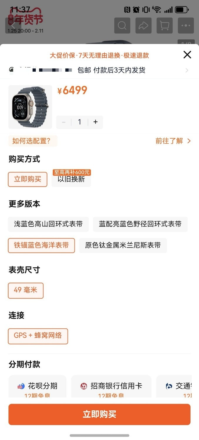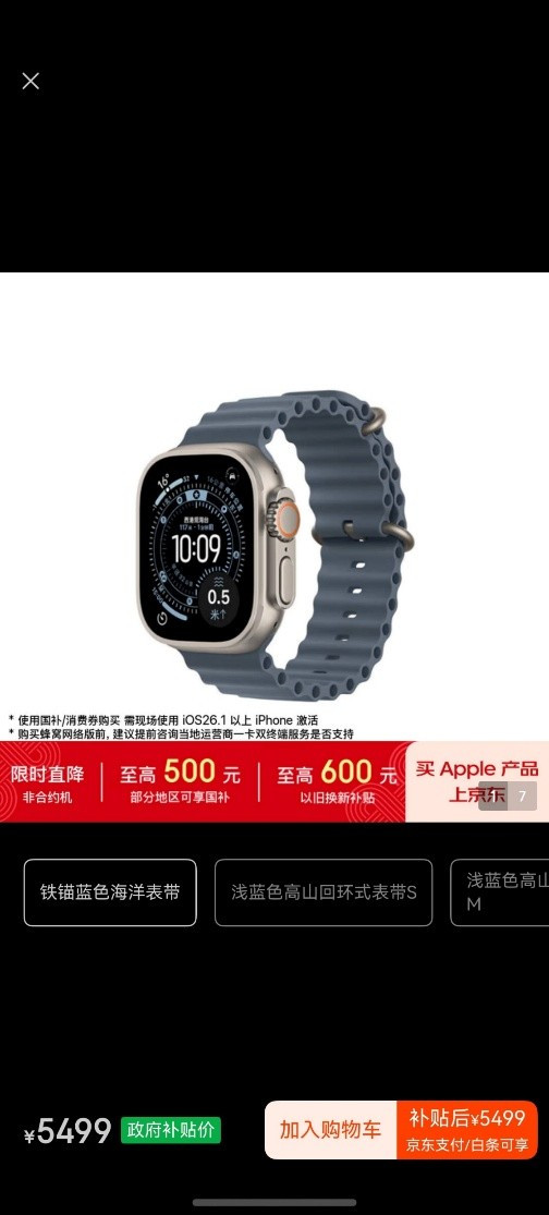 在腕表品类中,具有辨识度的铁锚蓝色海洋表带Apple Watch Ultra 3在天猫年货节的售价6499元;京东通过限时直降访佛部分地区500元国补,最终凯旋价仅为5499元,比天猫优惠1000元。