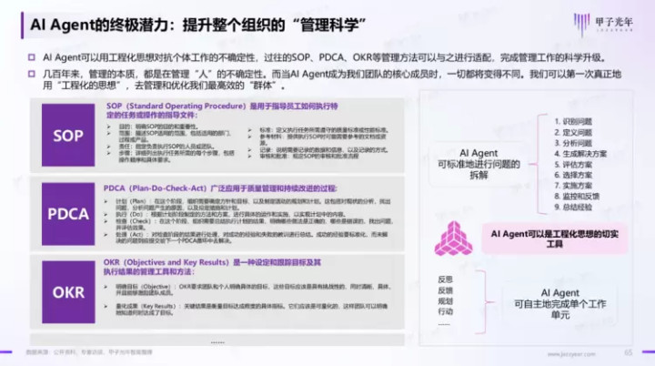 联系词,当阛阓多数聚焦于AIAgent的用具属性时,甲子光年在《企业级AIAgent(智能体)价值及利用陈述》中提议了颠覆性不雅点:AIAgent的终极主见并非单纯替代东说念主工完成近似任务,而所以工程化念念想重塑组织按捺的底层逻辑,鼓动总共组织“按捺科学”的系统性升级。