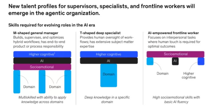 正如麦肯锡在《TheAgenticOrganization》陈述中提议,未来组织需要三类中枢东说念主才:具备系统念念维的M型通才按捺者,认真整合与编排AI资源,搭建东说念主机协同的举座框架;兼具业务深度与AI透露的T型行家,认真将业务需求调动为AI可实施的规矩,搭建东说念主机互助的业务场景;以及具备AI协同才气的一线职工,专注于AI难以替代的东说念主际交互、价值判断与创新突破。
