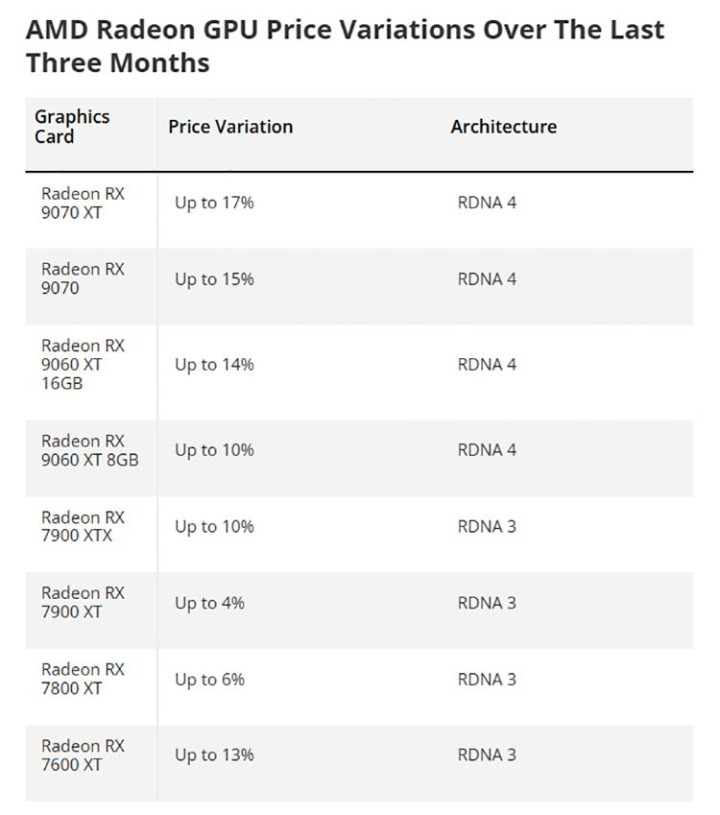 然则提及来容易作念起来难,在昔日三个月里,Radeon RX 9070XT的加价幅度达到了17%,9060XT 8G这种8G显存的显卡加价幅度稍显和煦,但也有10%;即使是上一代的Radeon RX 7000系列也通常未能逃过价钱高涨的影响。