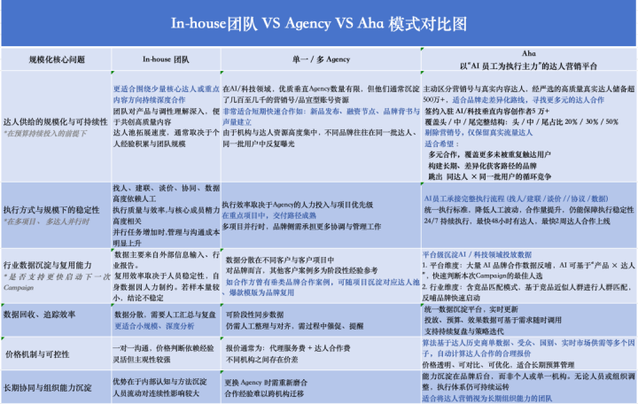 简便总结,In-house更像用组织一致性换内容深度,Agency偏向用外部资源换启动速率,平台型AI实行侧重用系统化换并行与复利。
