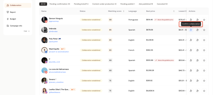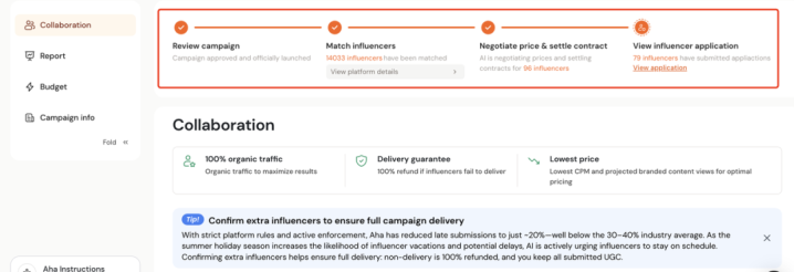 仍是证明互助意向并完成价钱谈判的达东说念主,将融合进入品牌的待审核列表。数据炫夸,在Aha平台上,品牌最快在48小时内,就能赢得一份已证明互助意向与最终价钱的优质达东说念主清单,从反选到落地的折损被降到最低。值得一提的是,在Campaign持续运行期间,达东说念主仍可持续接单,清单相应连续新增,品牌遥远领有可反选、可激动的达东说念主储备。