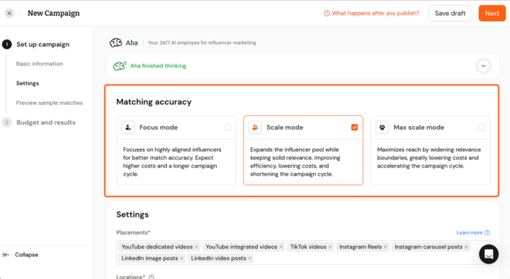基于这一领略,Aha的匹配计谋并非收紧,而是通过更庸碌但有抑遏的筛选逻辑,幸免因受众界说过窄而错失果真灵验的创作家。但同期也给了品牌方填塞的掌控权,不错在Campaign确立阶段就取舍一个匹配精确度档位。每个档位都对应不同的匹配计谋、掩饰范围,匡助客户在投放前就对结果形成知道预期。