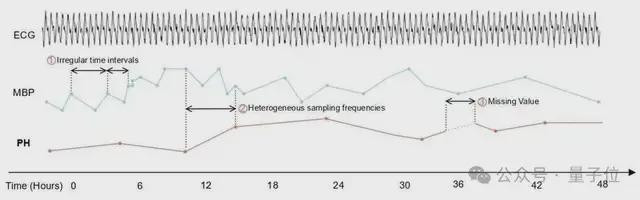 图2医学时候序列数据具有以下特色:(1)时候断毫不规矩,(2)采样率异质,(3)由于临床使命经过不规范或仪器按照不到位酿成的数据缺失。
