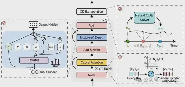 MIRA的架构如下:(1)采纳不规矩时候序列和时候戳算作输入,并应用CT-RoPE进行一语气时候编码。(2)夹杂行家层把柄频率路由到不同的Expert。(3)NeuralODE模块将潜在现象演化到纵容标的时候戳,牛牛app从而竣事活泼的时候感知展望