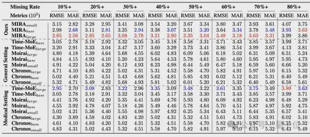 实验标明,即便在数据很是稀零(举例仅保留30%不雅测点)的条款下,MIRA的性能依然保捏慎重,并未像传统展望模子那样出现性能的显耀下滑。这种对真确寰宇“脏数据”的稳健才气,证明了其在复杂临床环境下的高鲁棒性。