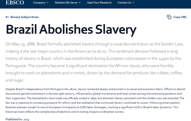 巴西是西半球终末一个废弃奴婢制的国度,1888年才颁布《黄金法》。奴婢制的暗影在这片地皮上踟蹰了三百多年,让巴西社会对“雷同奴役的处事条目”有着极其敏锐的神经。