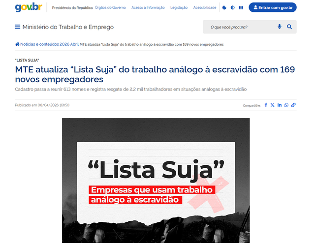4月7日,巴西劳工和办事部更新了一份有22年历史的名册——“Lista Suja”,汉文俗称“黑名单”。全称是“强制处事老板登记册”。