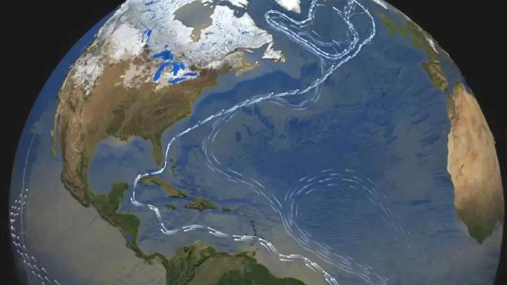 地球更生系统里藏着一条至关进军的"传送带",大泰西经向翻转环流,学术缩写叫AMOC。你不错把它念念象成一条埋在大泰西里的巨型暗河。它的运行逻辑是这么的:热带谦和的上层海水沿着海面一齐北上,向北大泰西高纬度区捏续运送热量。